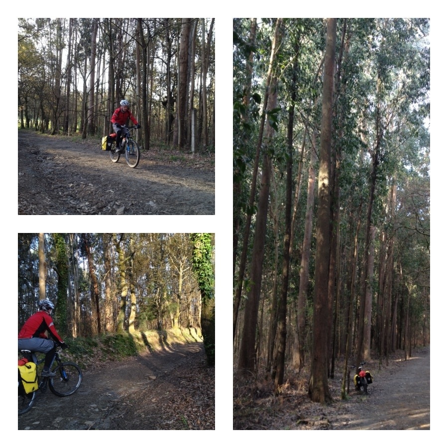 Aunque parezca que falta poco, los primeros 25 o 30 kilómetros del día siguen el mismo patrón que los dos días anteriores. Caminitos entre bosques en los que predominan altísimos eucaliptos se combinan con alguna carretera local en nuestro avance hacia Santiago.
