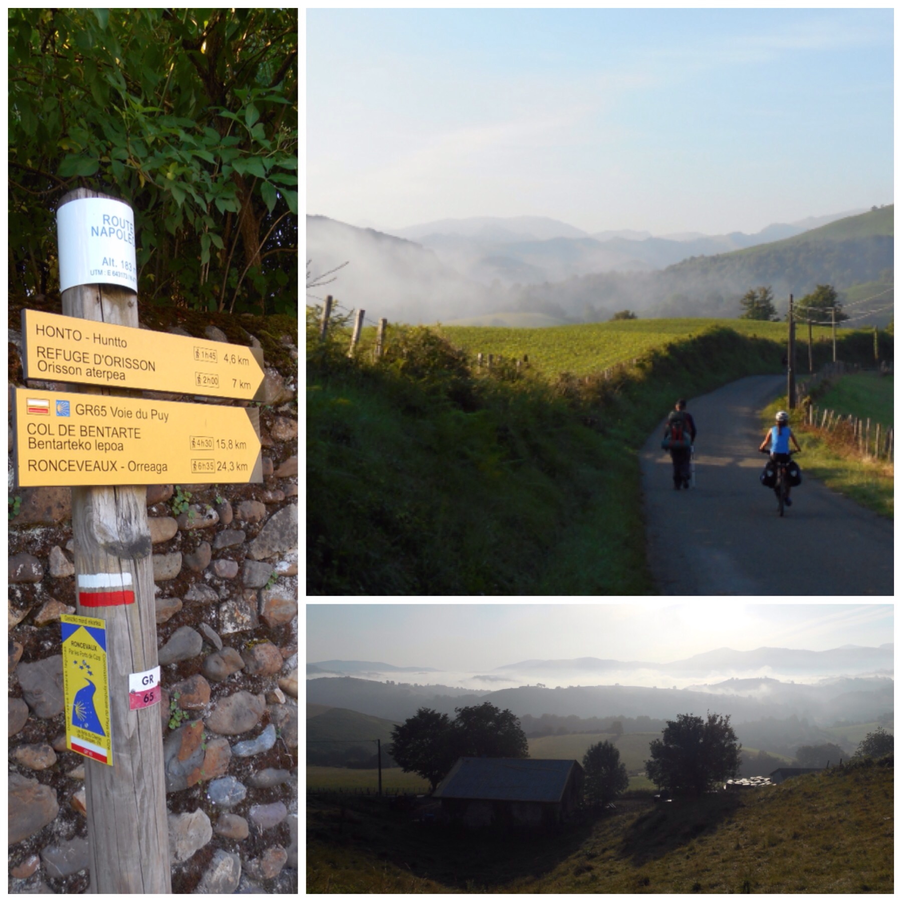 Salimos temprano de Saint Jean a través de sus calles empedradas (mejor dicho de «la calle» empedrada porque el pueblo se articula alrededor de prácticamente una sola calle). Sin poder ni calentar, nada más salir del pueblo empieza una ascensión constante. Los primeros 4 o 5 km son de asfalto y enseguida nos elevamos sobre el fondo del valle que aparece cubierto de niebla. Una estampa preciosa.