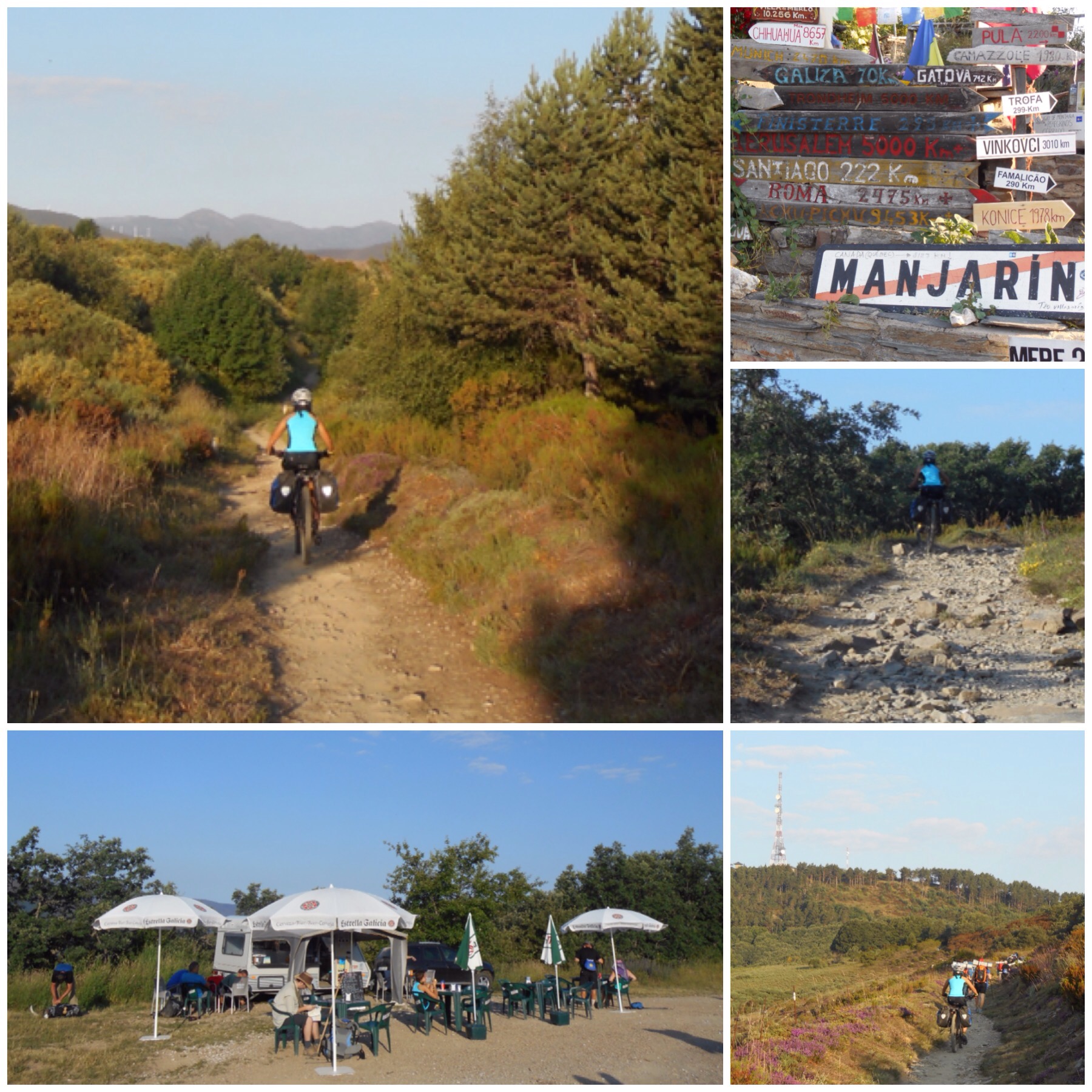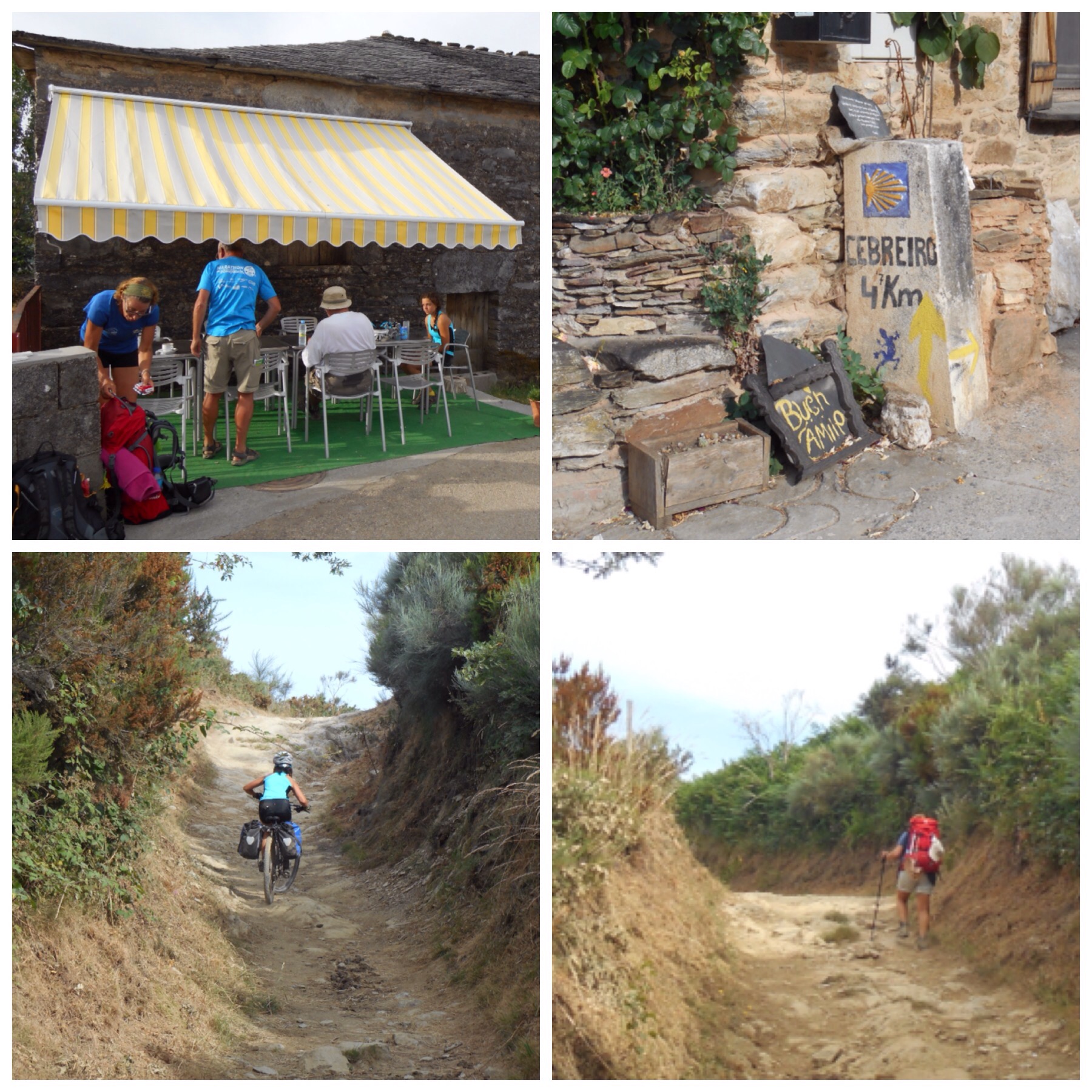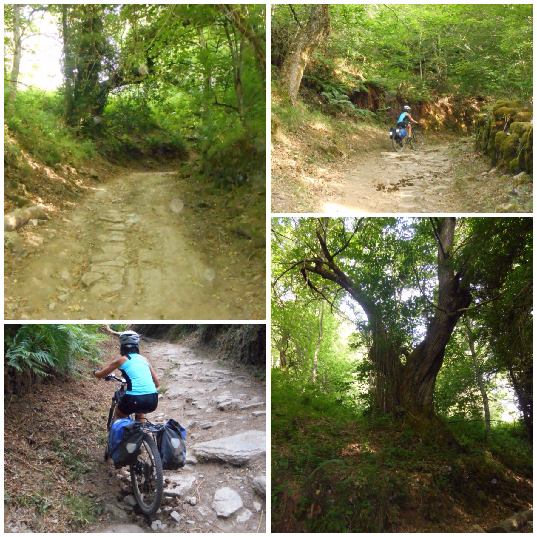 Hoy teníamos por delante la etapa más dura de todo el Camino Francés, sólo comparable a la travesía de los Pirineos entre Saint Jean y Roncesvalles. Los primeros 20 km desde Villafranca son de transición, ascendiendo progresivamente por terreno fácil, mayoritariamente andaderos paralelos a carreteras, hasta llegar a un pueblo llamado Las Herrerías. A partir de aquí empieza la subida de verdad. Un kilómetro después hay la señal que marca sendero a pie por la izquierda y bicis recomendado por la derecha, por la carretera asfaltada. Nosotros, como hice ya en 2013, elegimos la senda de los que van a pie. La subida tiene tres tramos. El primero es un camino con restos de una calzada romana y pendientes muy fuertes. El terreno es tan malo que de vez en cuando hay que arrastrar la bici unos metros pero al final solo son 1,5 km realmente complicados y a cambio se disfruta de una subida mucho más interesante que por la carretera.