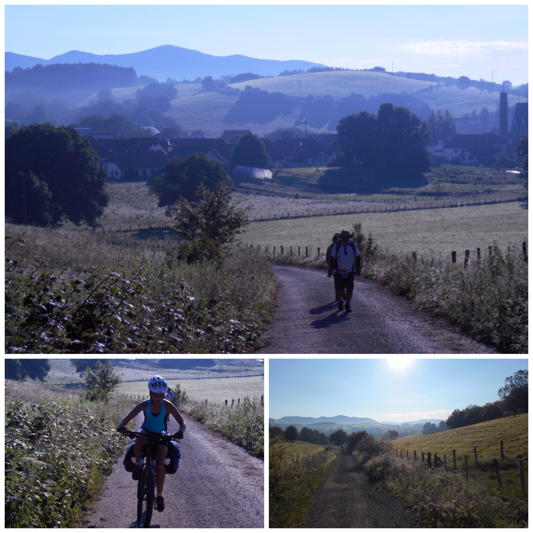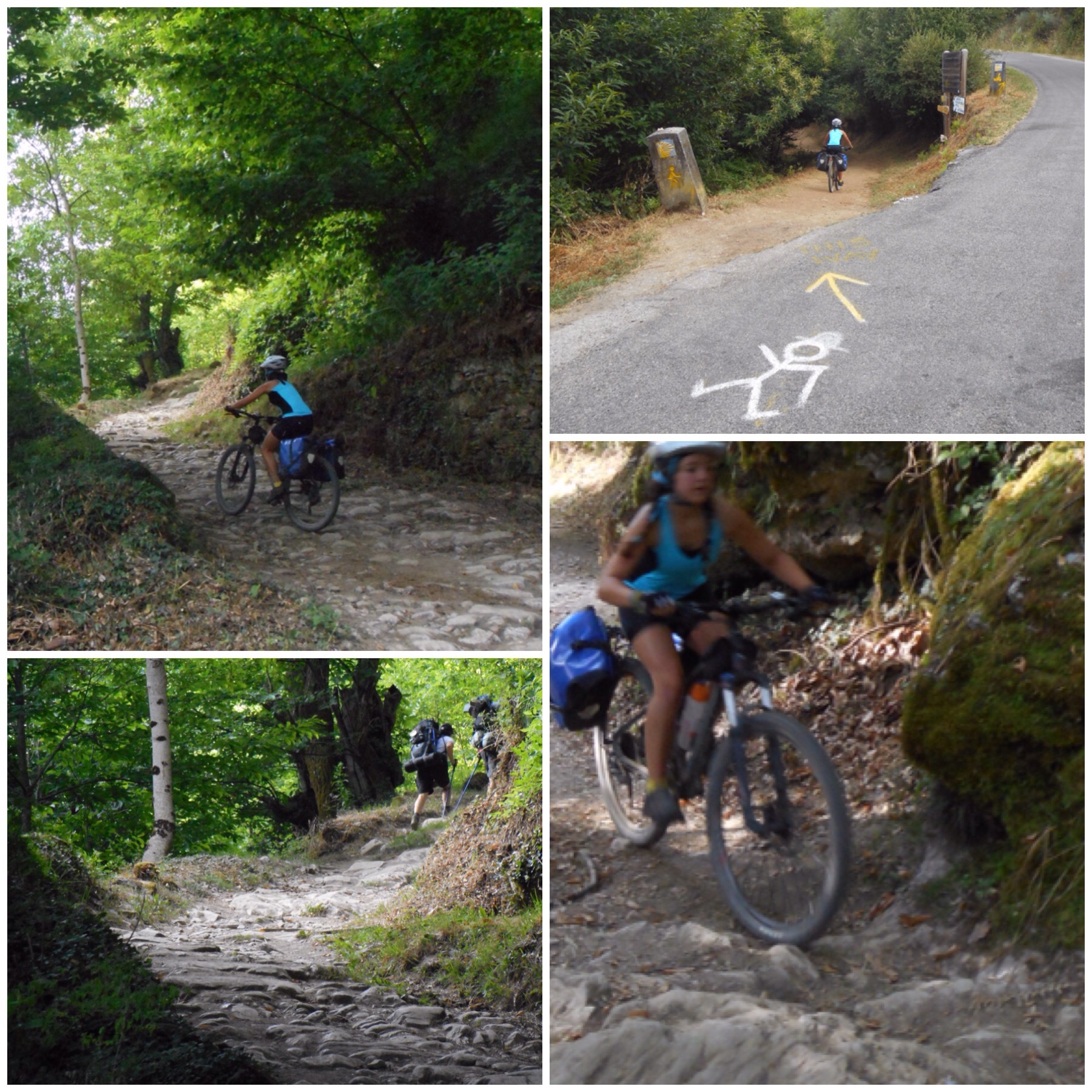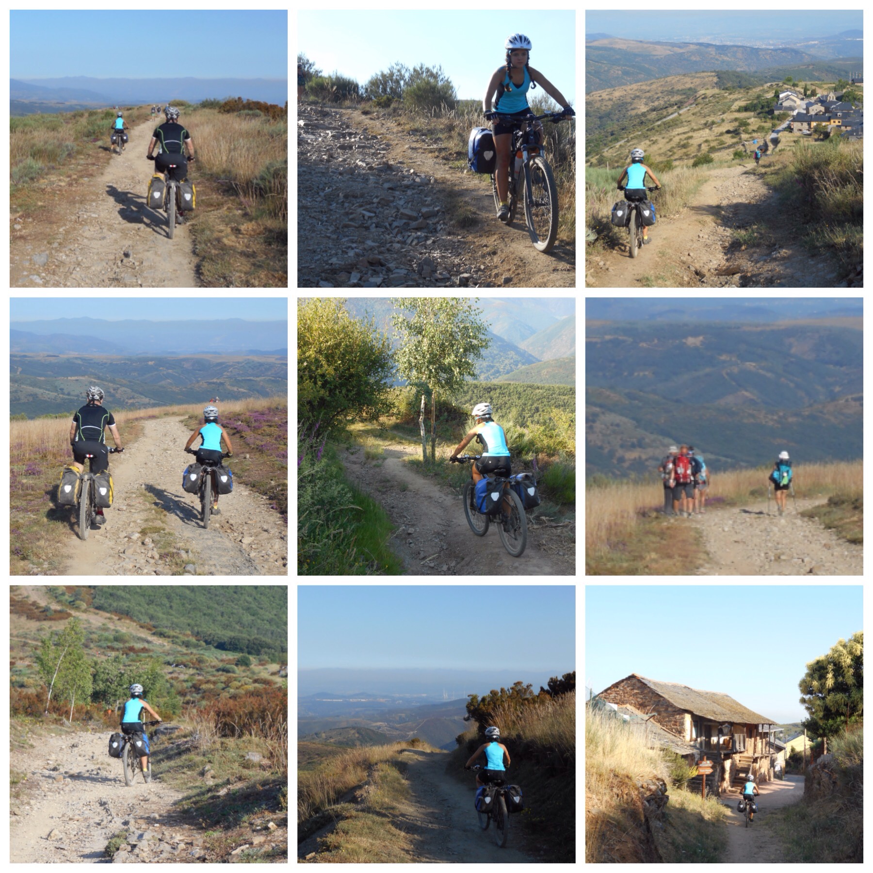 Hoy teníamos por delante la etapa más dura de todo el Camino Francés, sólo comparable a la travesía de los Pirineos entre Saint Jean y Roncesvalles. Los primeros 20 km desde Villafranca son de transición, ascendiendo progresivamente por terreno fácil, mayoritariamente andaderos paralelos a carreteras, hasta llegar a un pueblo llamado Las Herrerías. A partir de aquí empieza la subida de verdad. Un kilómetro después hay la señal que marca sendero a pie por la izquierda y bicis recomendado por la derecha, por la carretera asfaltada. Nosotros, como hice ya en 2013, elegimos la senda de los que van a pie. La subida tiene tres tramos. El primero es un camino con restos de una calzada romana y pendientes muy fuertes. El terreno es tan malo que de vez en cuando hay que arrastrar la bici unos metros pero al final solo son 1,5 km realmente complicados y a cambio se disfruta de una subida mucho más interesante que por la carretera.