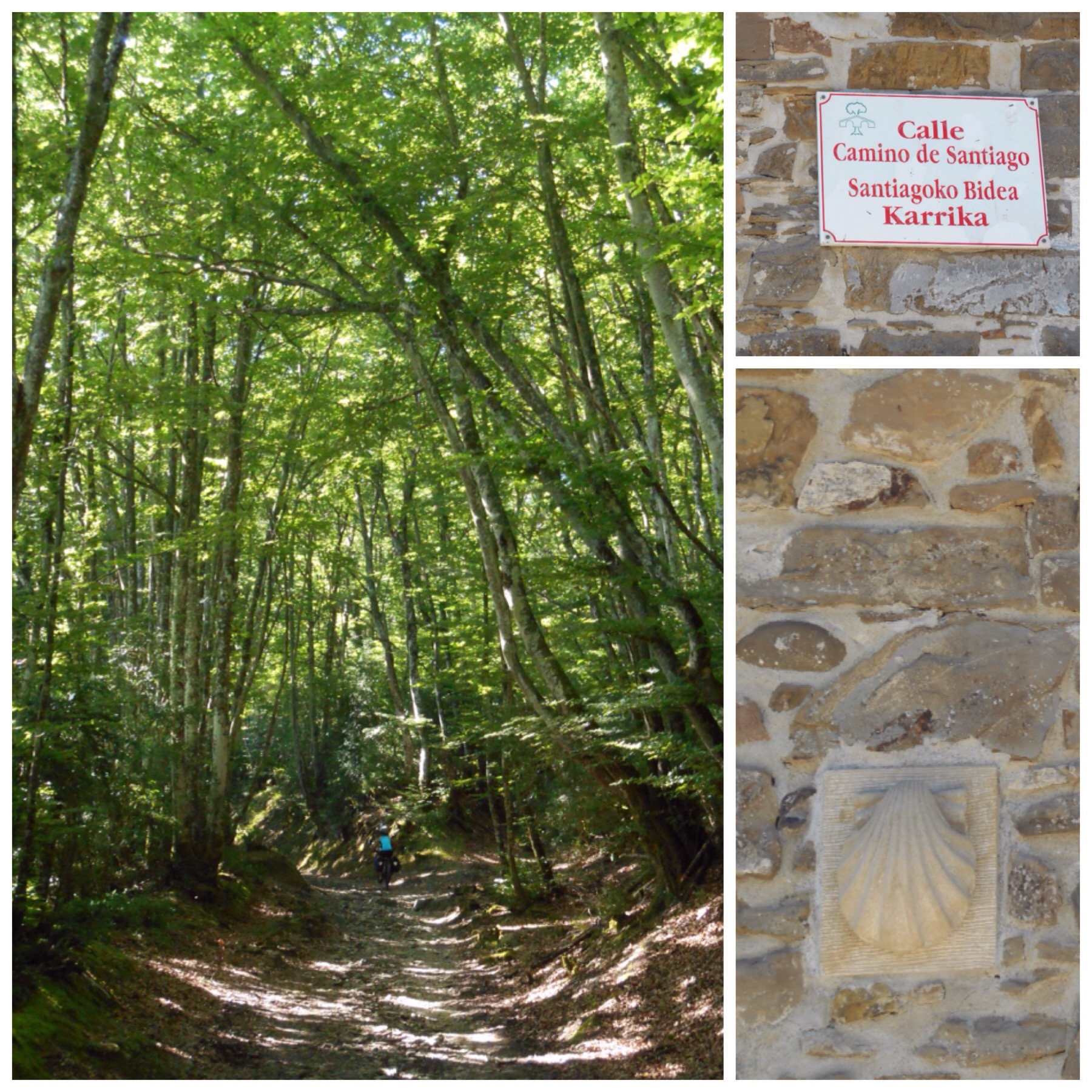Como muchos otros peregrinos, empezamos el día fotografiándonos junto al cartel de «Santiago 790 km» (aunque en realidad es un cartel de carretera que indica la distancia por la N-135). Después empiezan los primeros senderos entre bosques. A primera hora hace frío pero en cuanto el sol empieza a calentar en serio empezamos a pasar calor y ya no parará hasta Pamplona.