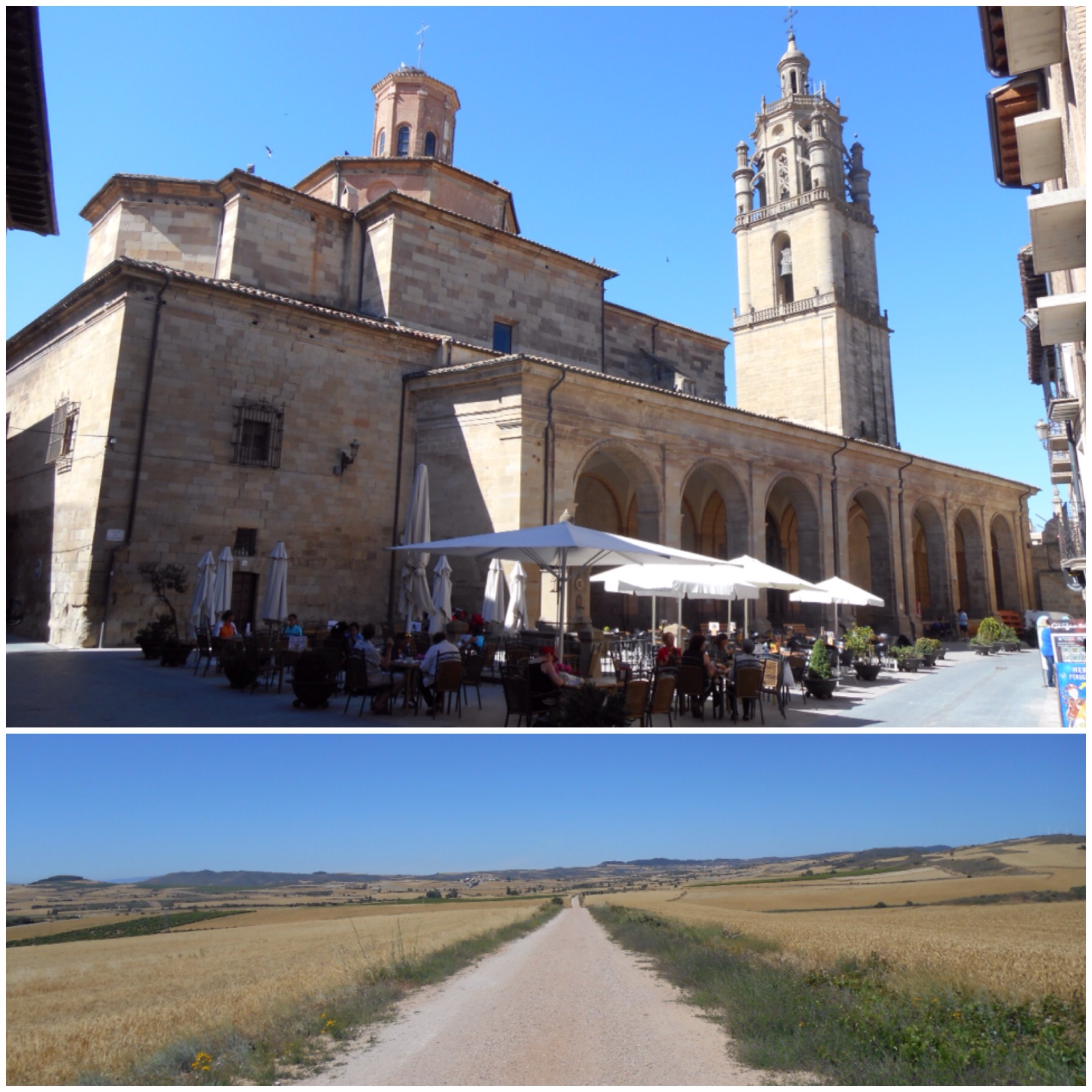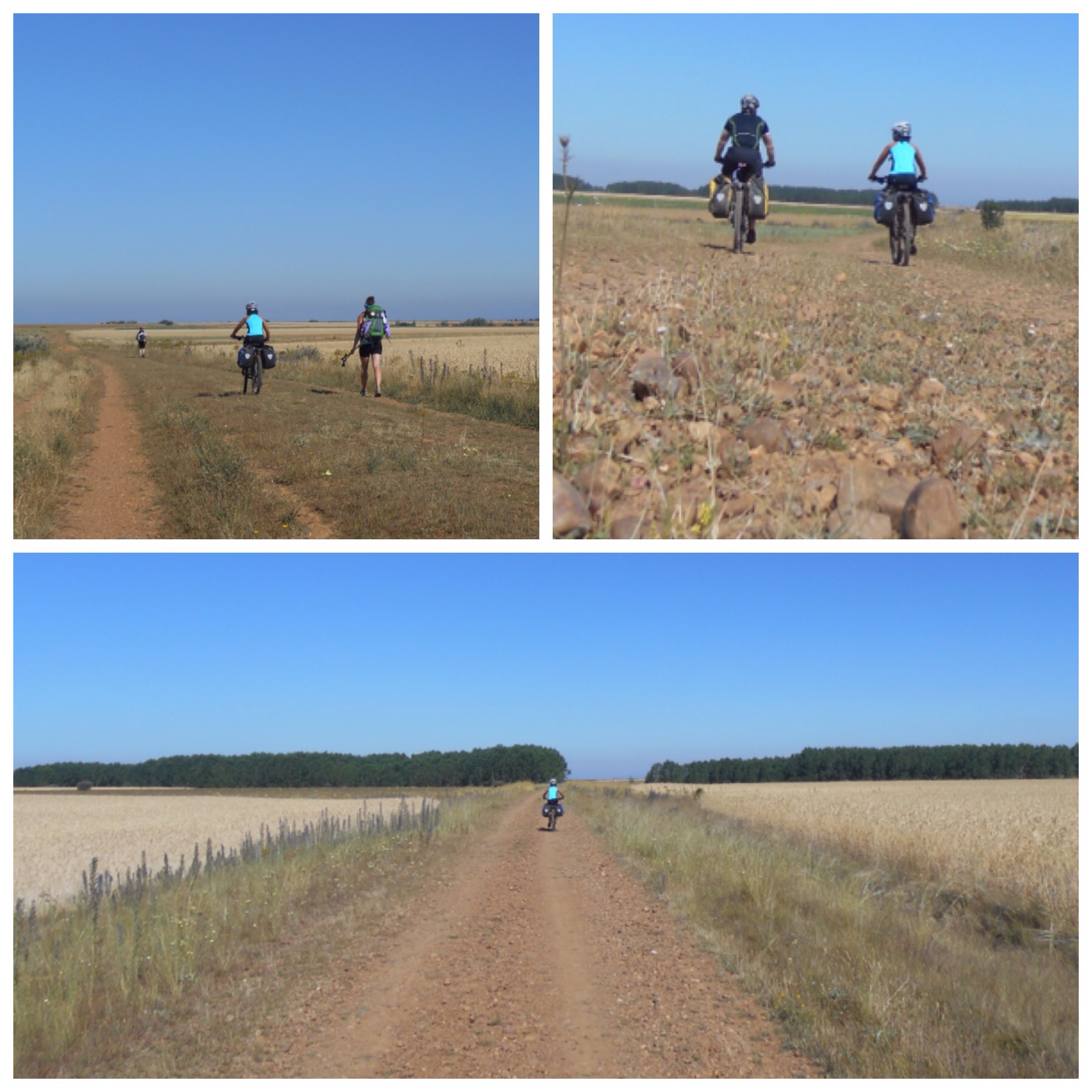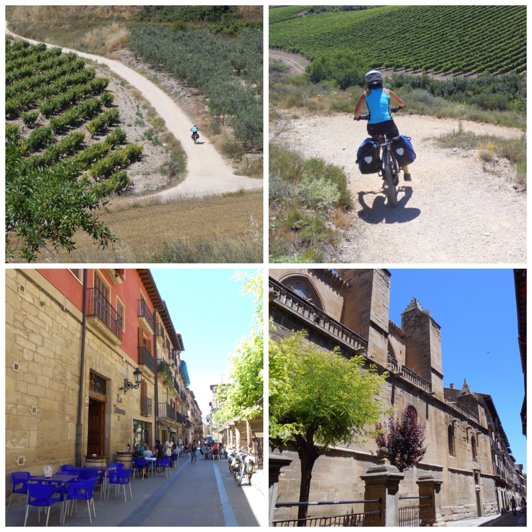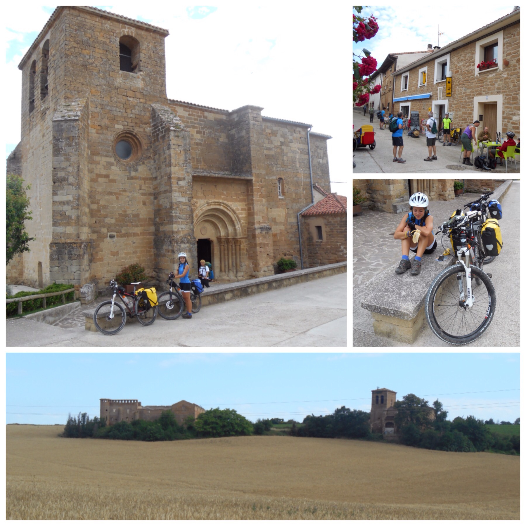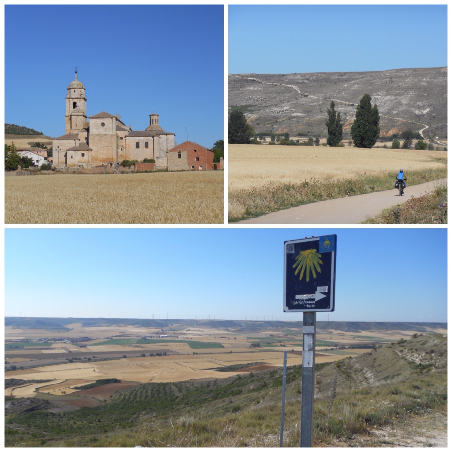 Después de Nájera los viñedos van desapareciendo y predominan grandes campos de trigo. La temperatura debe ser la misma pero los campos dorados dan la sensación de más calor que cuando estábamos rodeados de verde. Vamos coincidiendo con otros ciclistas a los que adelantamos y nos vuelven a adelantar durante todo el día según el ritmo de cada uno y las paradas que haga. Hay tres brasileños, por ejemplo, con los que coincidimos subiendo al Alto del Perdón hace dos días y que desde entonces vamos encontrando de vez en cuando.