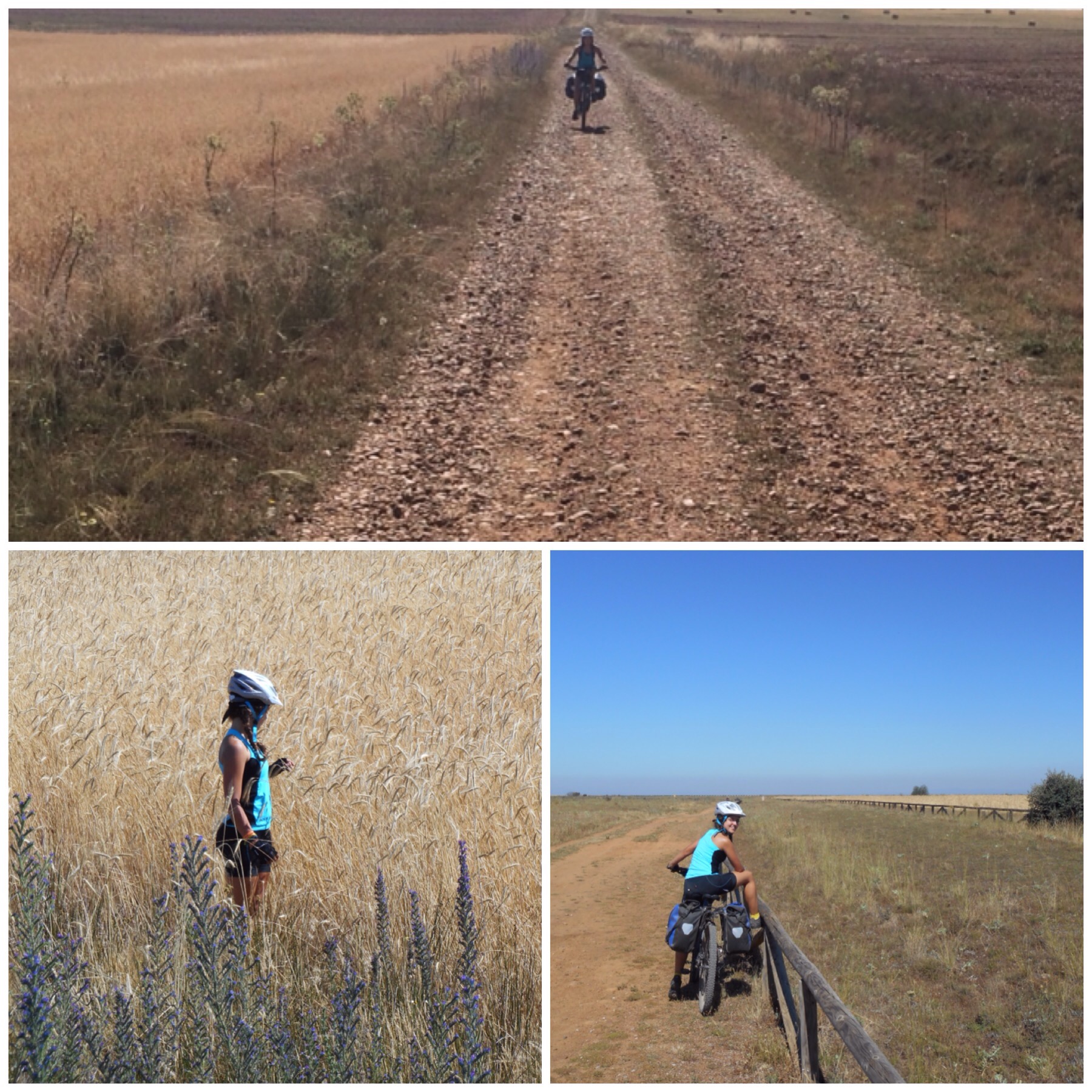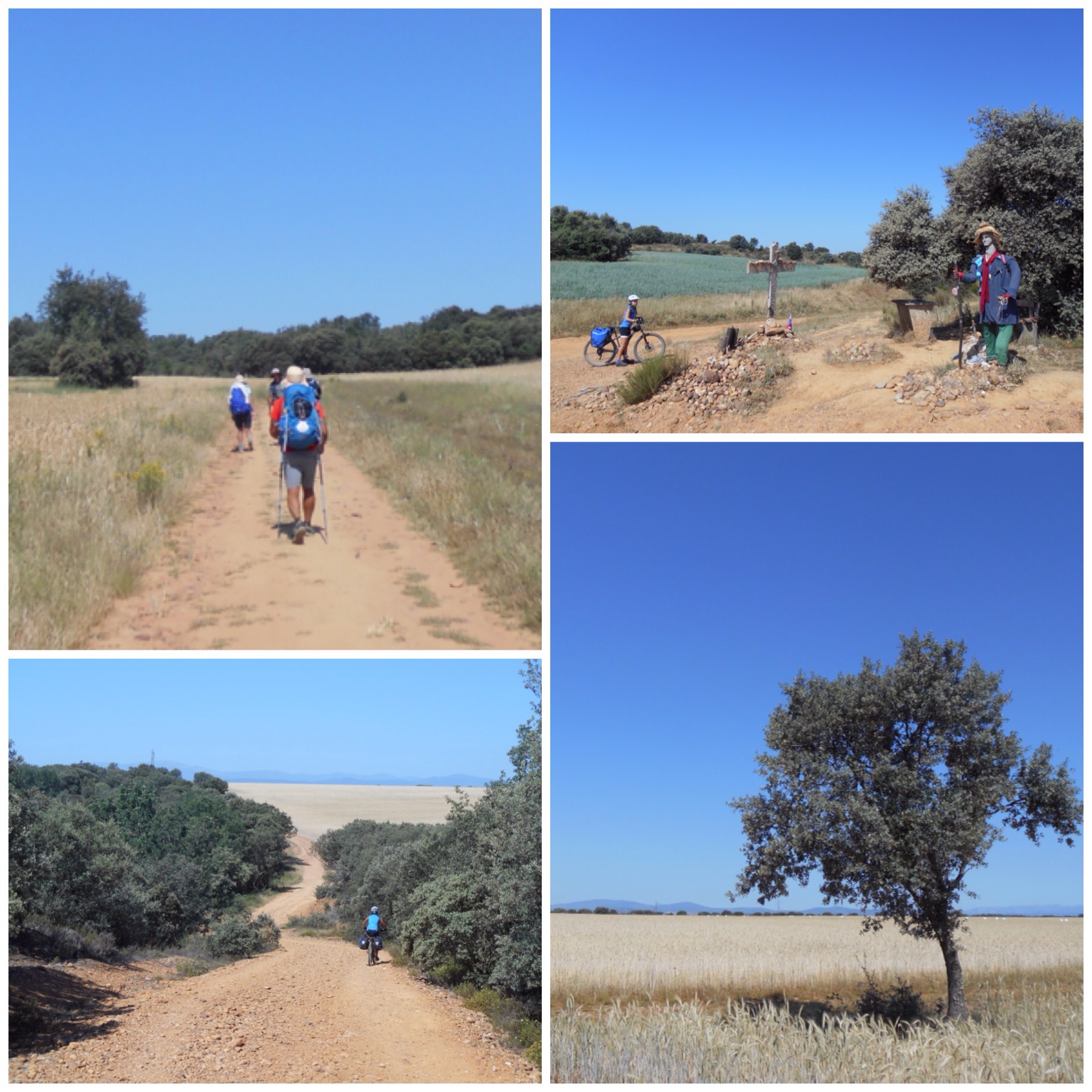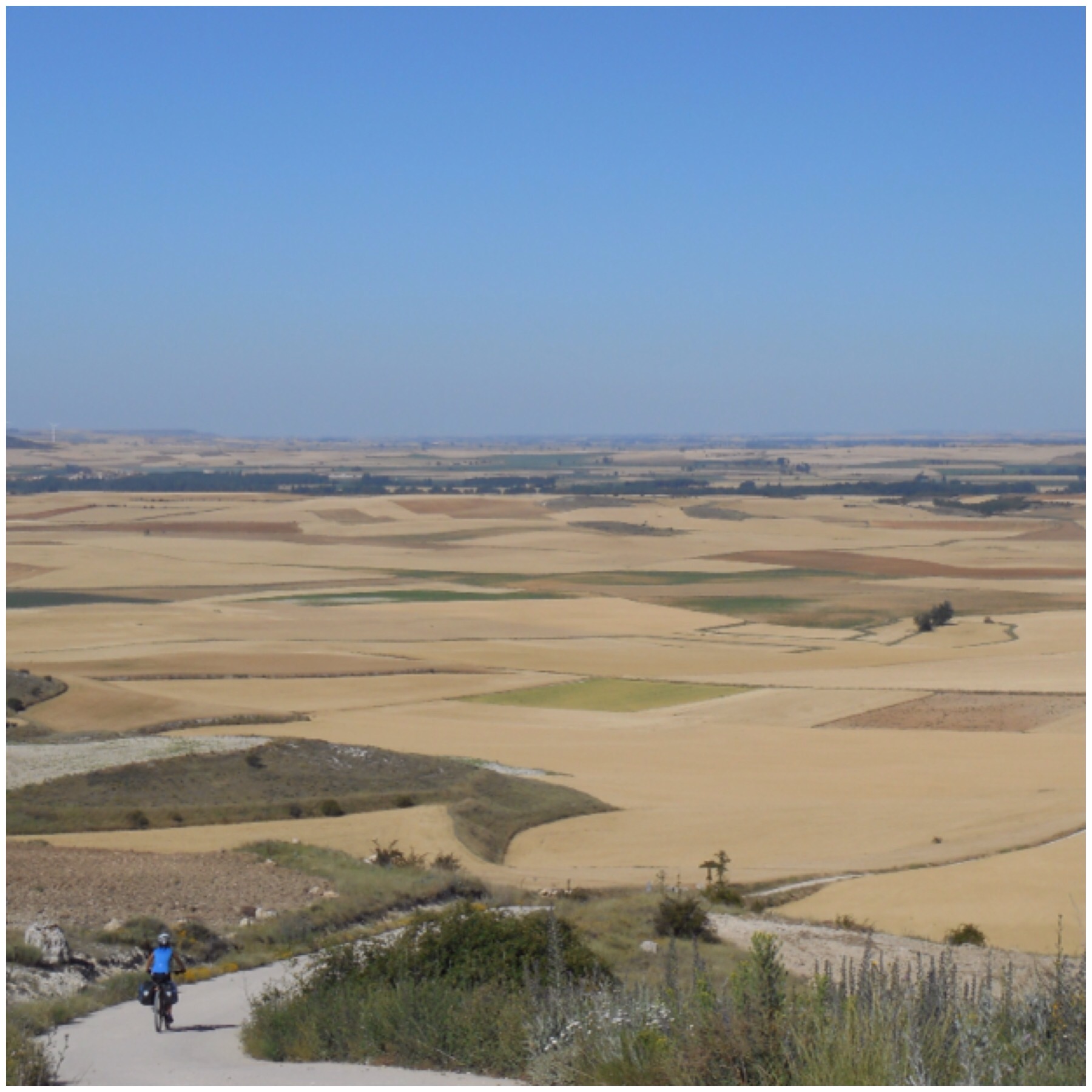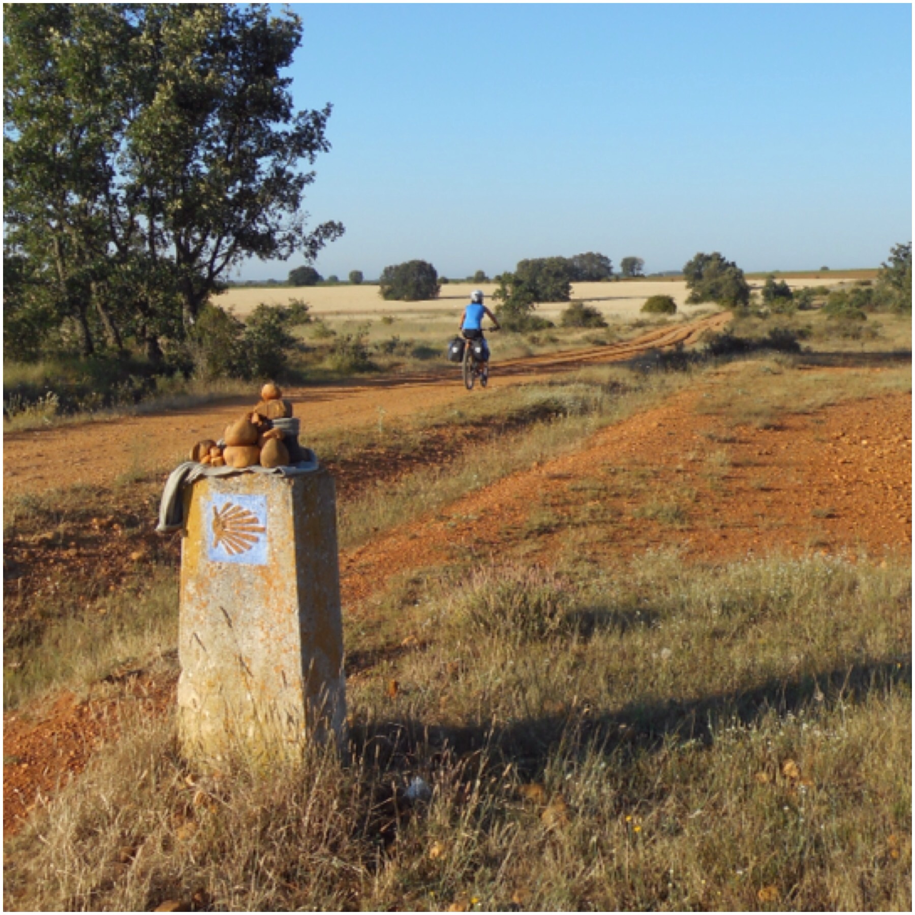 Después de Nájera los viñedos van desapareciendo y predominan grandes campos de trigo. La temperatura debe ser la misma pero los campos dorados dan la sensación de más calor que cuando estábamos rodeados de verde. Vamos coincidiendo con otros ciclistas a los que adelantamos y nos vuelven a adelantar durante todo el día según el ritmo de cada uno y las paradas que haga. Hay tres brasileños, por ejemplo, con los que coincidimos subiendo al Alto del Perdón hace dos días y que desde entonces vamos encontrando de vez en cuando.