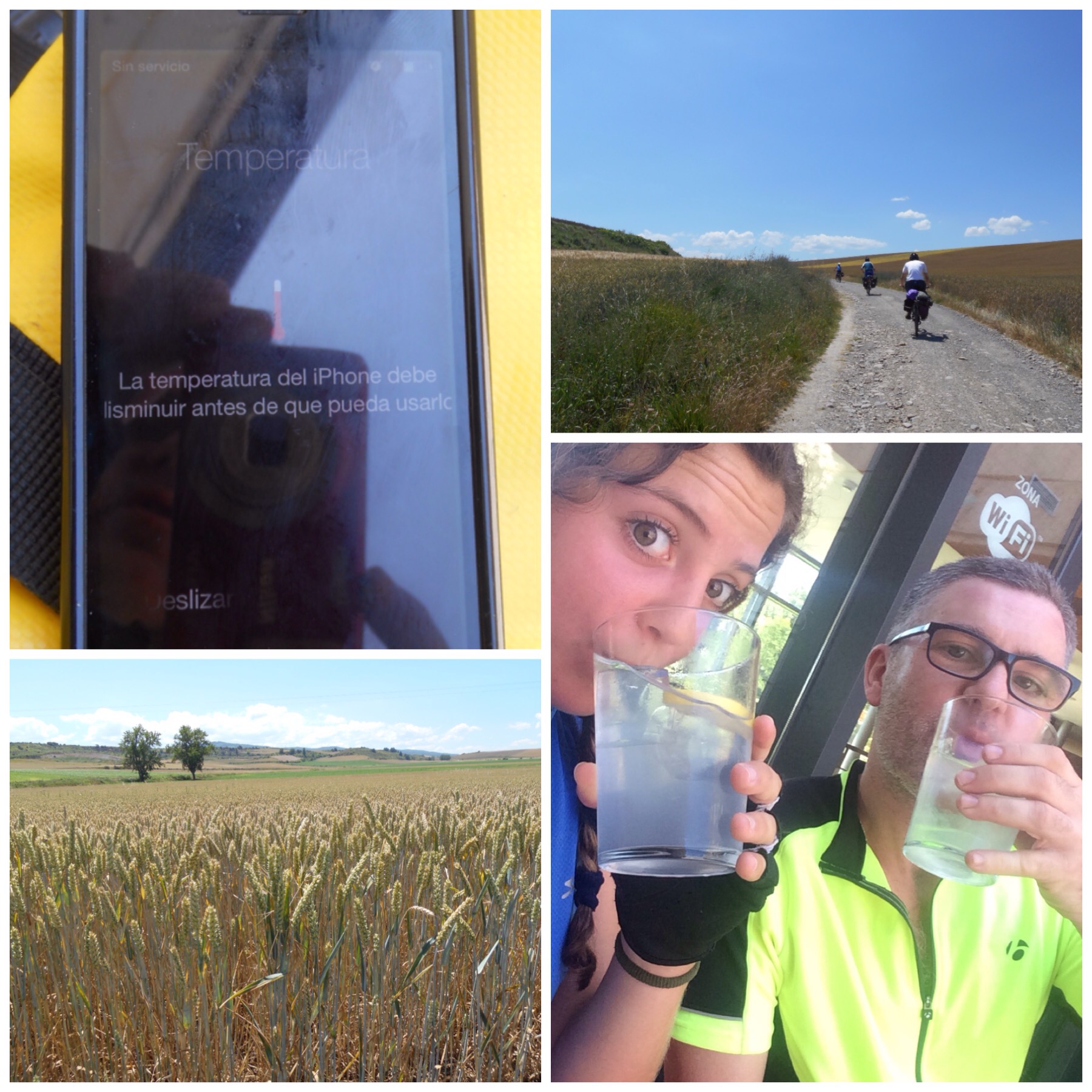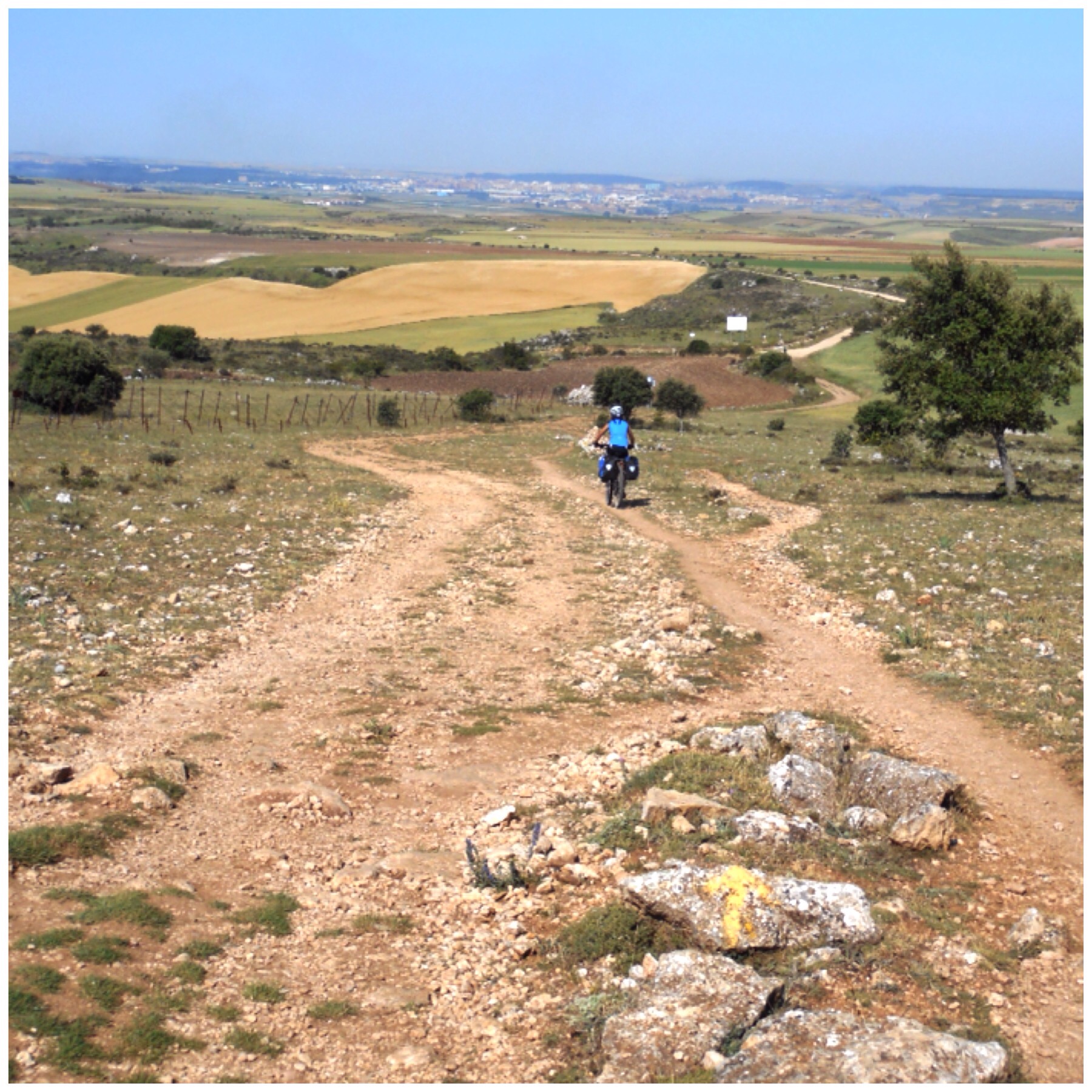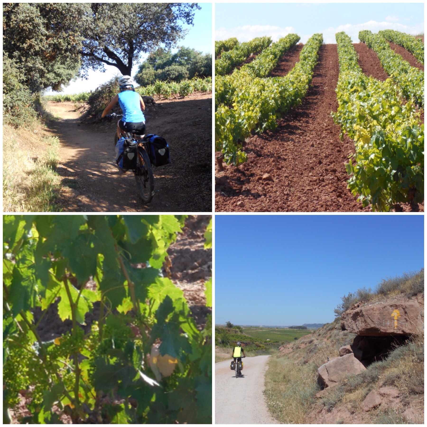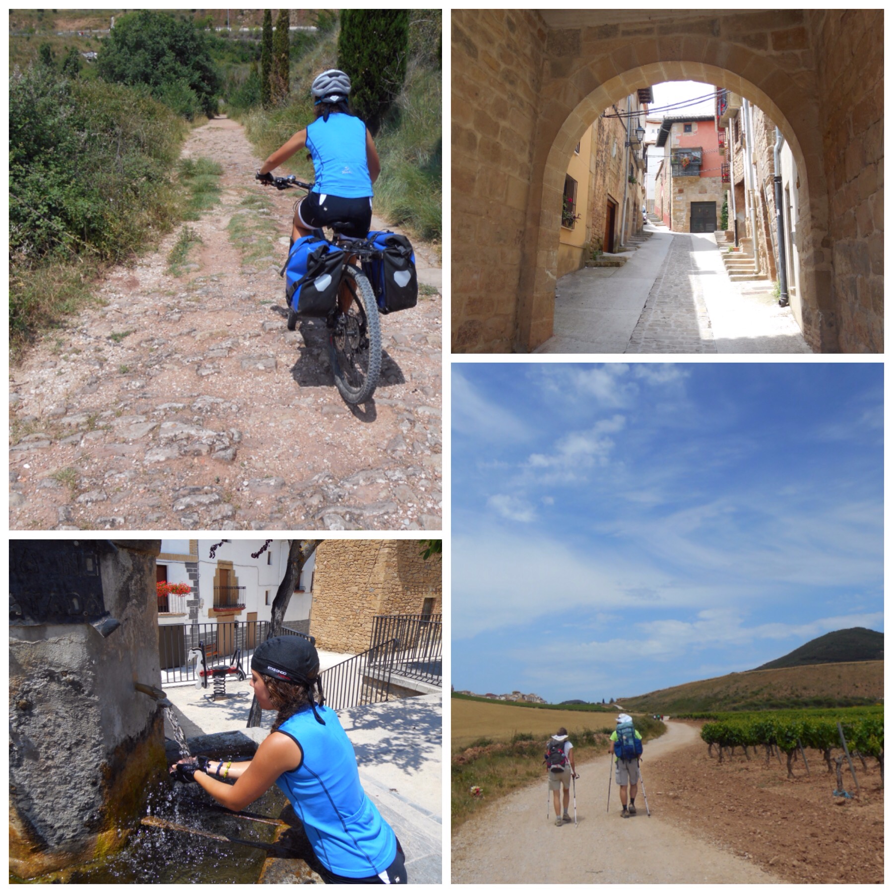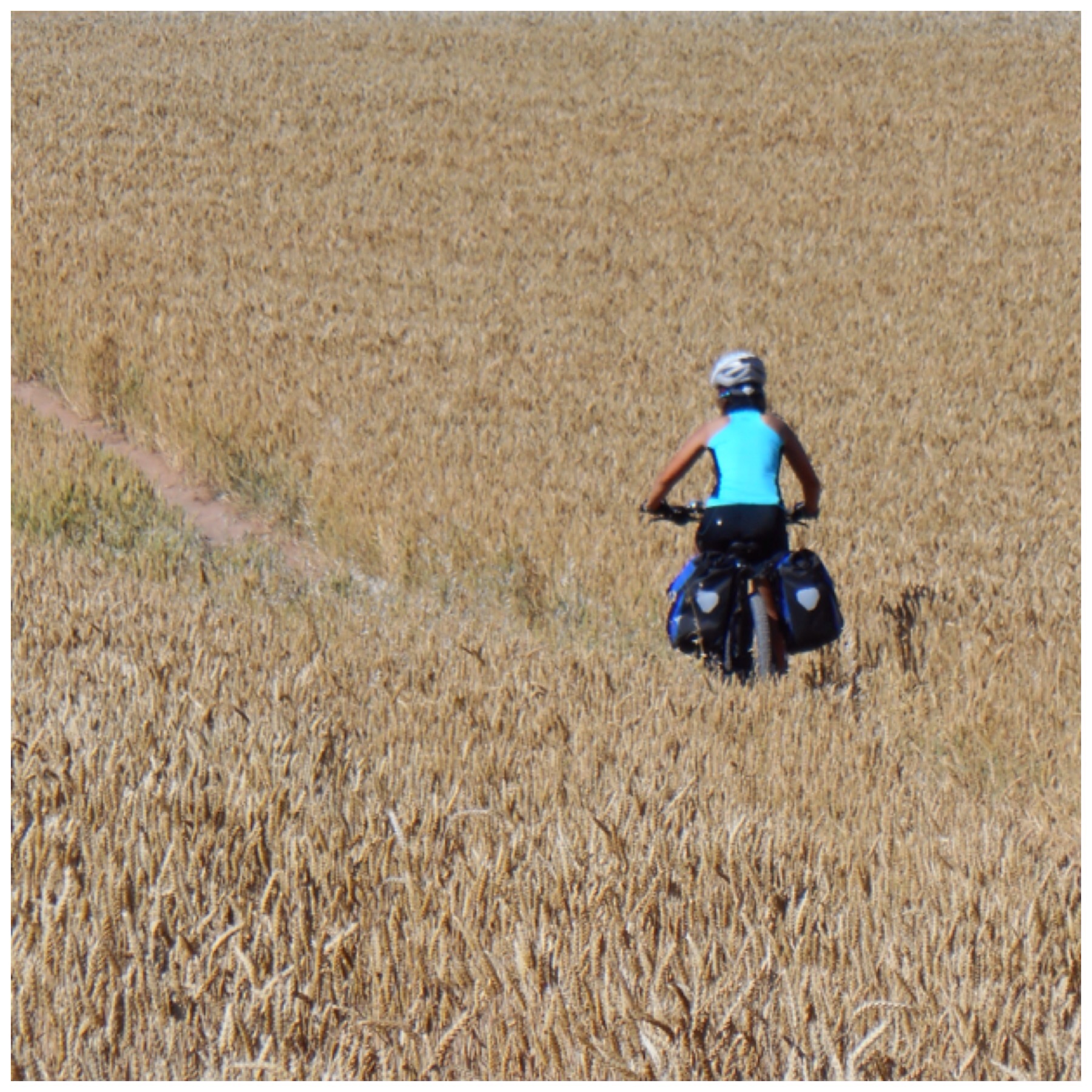 Después de Nájera los viñedos van desapareciendo y predominan grandes campos de trigo. La temperatura debe ser la misma pero los campos dorados dan la sensación de más calor que cuando estábamos rodeados de verde. Vamos coincidiendo con otros ciclistas a los que adelantamos y nos vuelven a adelantar durante todo el día según el ritmo de cada uno y las paradas que haga. Hay tres brasileños, por ejemplo, con los que coincidimos subiendo al Alto del Perdón hace dos días y que desde entonces vamos encontrando de vez en cuando.