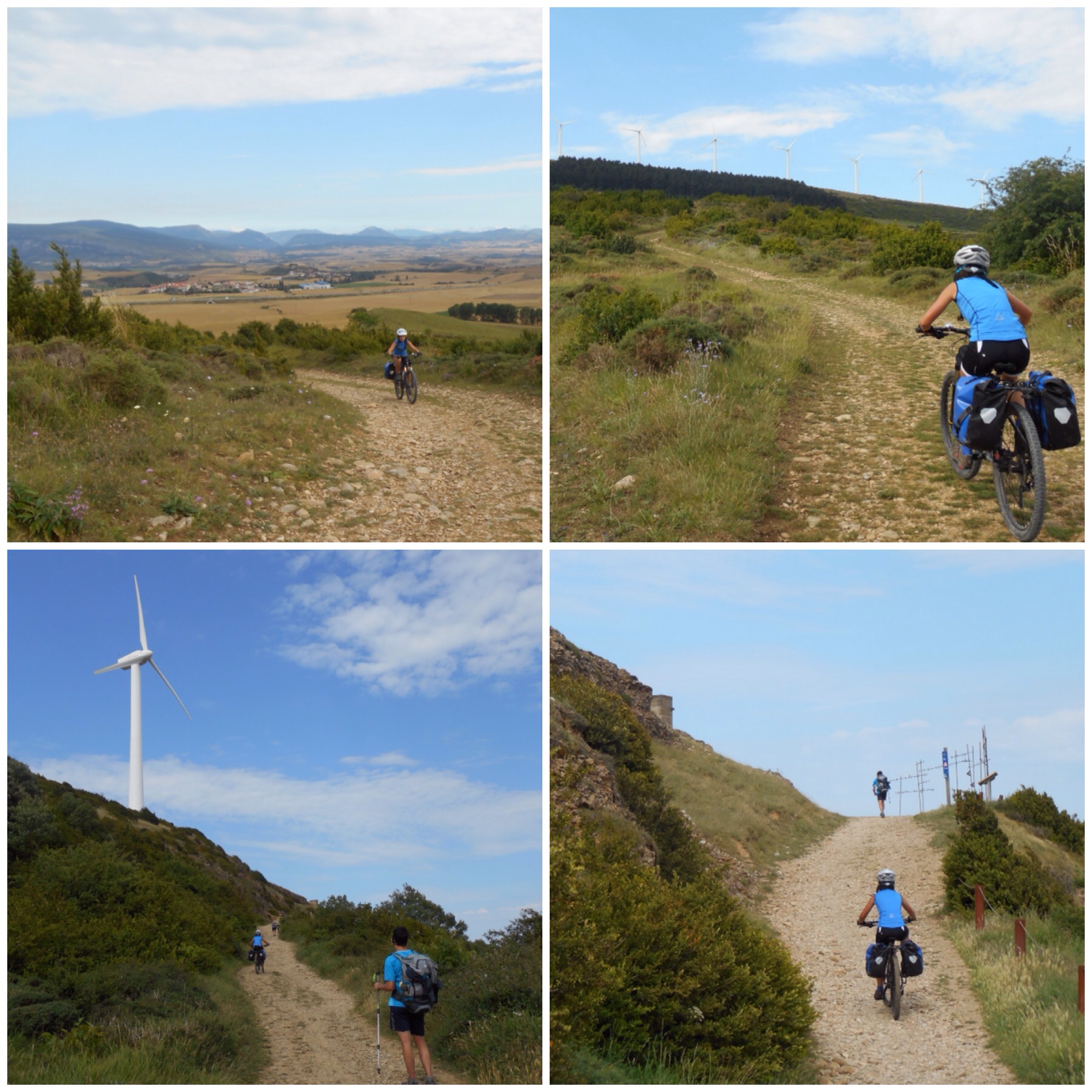 Nada más salir de Pamplona se ven a lo lejos las siluetas de los aerogeneradores en lo alto de la Sierra del Perdón hacia la que nos dirigimos. Decenas de peregrinos a pie y unos cuantos en bici seguimos la misma pista pedregosa que empieza a ganar altura poco a poco entre campos de cereal. De vez en cuando hay algún repecho que nos hace sufrir y como pasa siempre más de un caminante alucina al ver «como sube la niña»