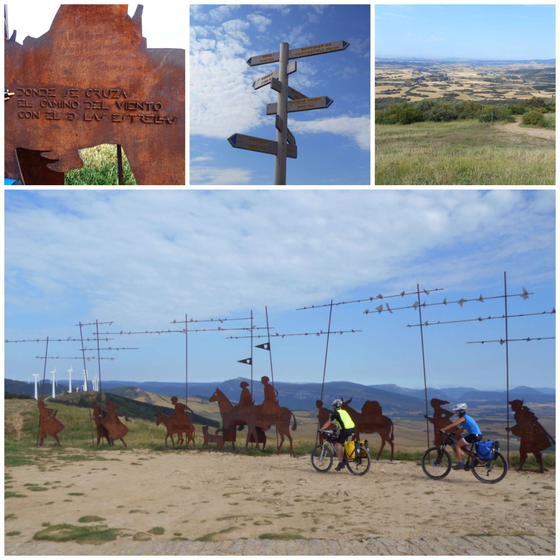 En el monumento a los peregrinos que hay en la cima está escrito «Donde se junta el camino del viento con el de las estrellas» y realmente el viento es espectacular. No se nota pocos metros más abajo ni por el lado que hemos subido ni por el que bajaremos y en cambio en la loma de la Sierra sopla con ganas. El día está casi completamente despejado y permite ver muy lejos en todas direcciones.