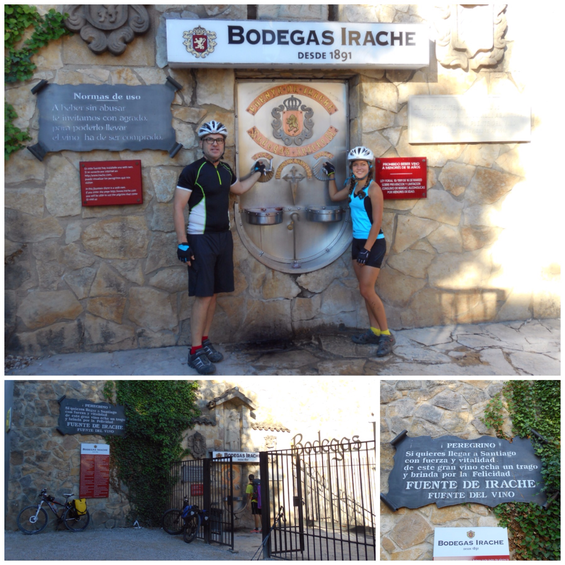 La primera parada del día, muy cerca de Estella, son las bodegas Irache y su famosa fuente del vino que regala cien litros de vino al día para los peregrinos que pasan. También tiene un surtidor con agua, no os penséis que estoy viciando a Blanca desde tan joven…