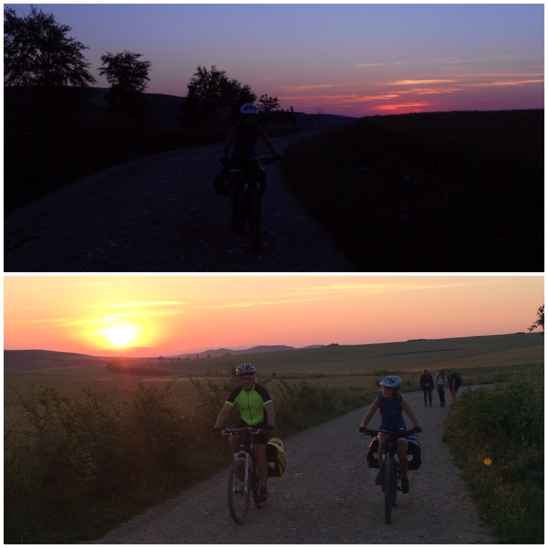 Hoy teníamos por delante dos retos importantes, las subidas de los Montes de Oca y del Alto de Atapuerca. Siguiendo la máxima de Einstein «Si quieres resultados diferentes no hagas siempre lo mismo», hemos cambiado de táctica para evitar pasar el calor de ayer. Nos hemos levantado a las 5.15 y a las 6 estábamos ya en marcha. Aún no había amanecido y teníamos que alumbrarnos con las frontales pero enseguida ha clareado y, mientras circulábamos entre Belorado y Tosantos, el sol ha aparecido a nuestra espalda, regalándonos este bonito amanecer.