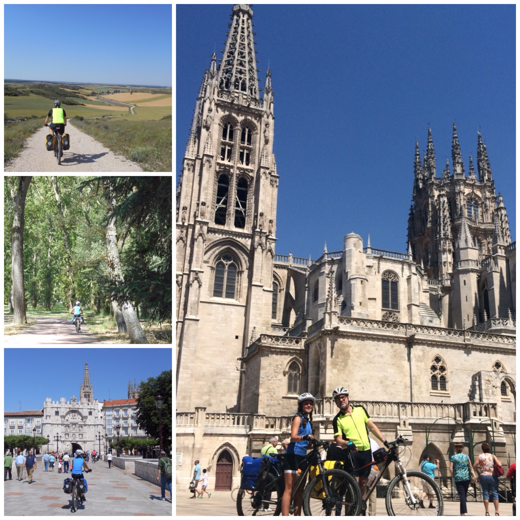 El madrugón ha sido tan útil que a las 12 de la mañana estábamos en Burgos, nuestro destino de hoy. Hemos podido comer bien, descansar, lavar las bicis, hacer la colada, comprar algunas cosas como crema solar que se nos estaban acabando y tantas otras cosillas «prácticas» que no salen en el blog pero que también forman parte del día a día de este viaje. Casi no hemos pasado calor y hemos tenido tiempo para muchas cosas, ¡seguid la máxima de Einstein!