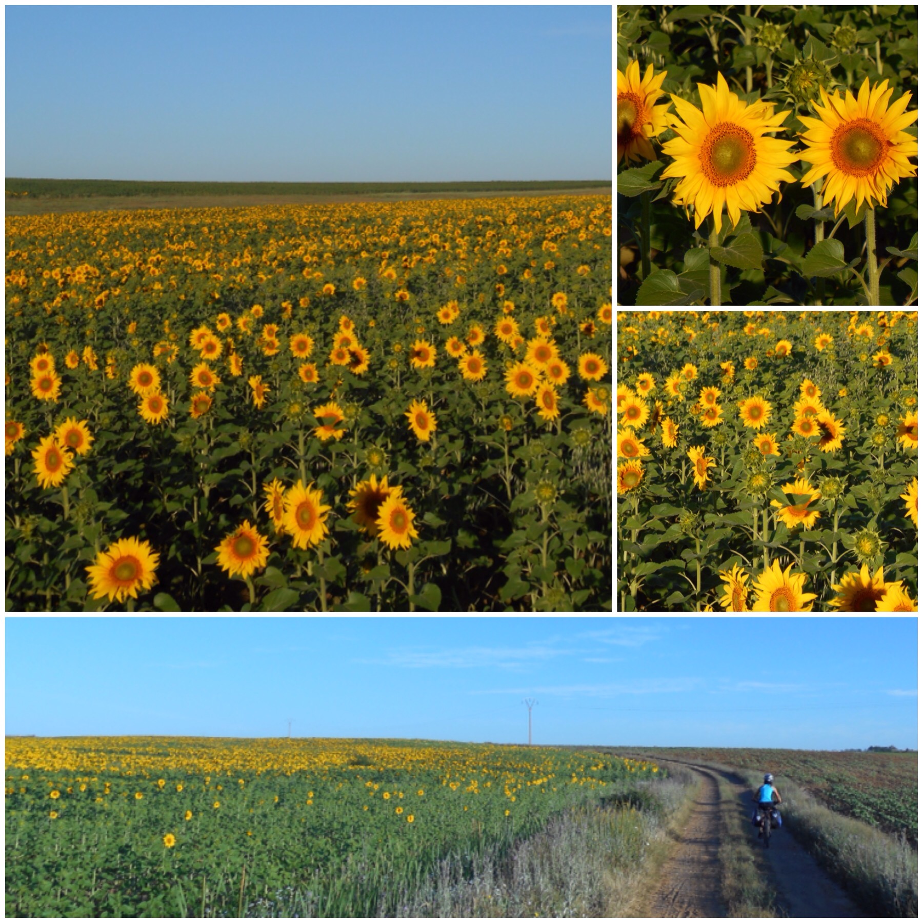 La novedad ha sido que entre tanto trigal han aparecido también algunas plantaciones de girasoles que con el sol de la primera hora del día se veían de un amarillo intenso. Al menos hemos cambiado momentáneamente de paisaje.