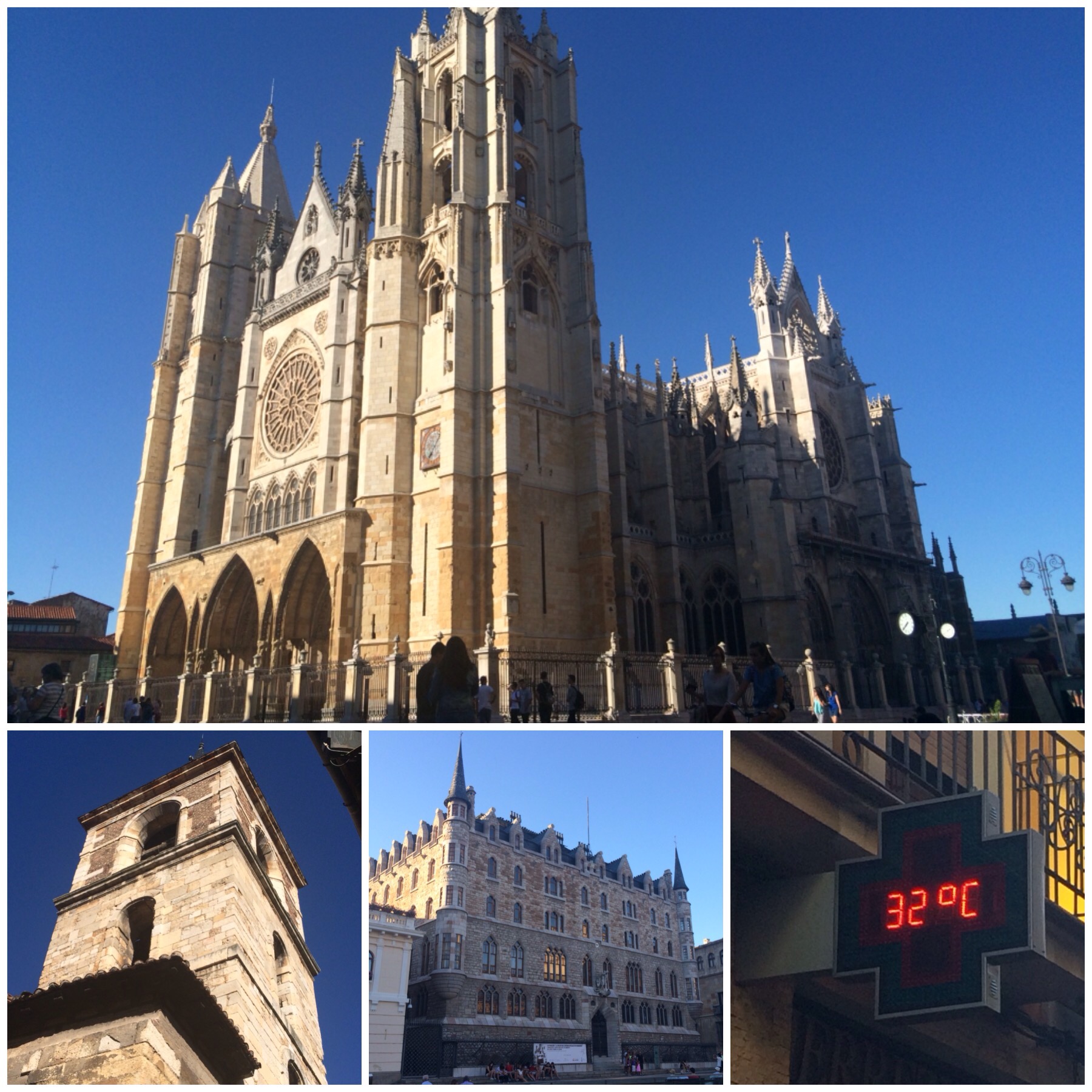 Pasamos la tarde en el Albergue Check In León, uno nuevo y moderno inaugurado hace solo un par de meses. Por primera vez incluso dormimos algo de siesta. Más tarde damos una vueltecita por la ciudad, en la que a las 20.30 h un termómetro en una calle en sombra marca 32 grados… Mientras paseábamos hemos visto llegar dos bicicletas y eran los jóvenes brasileños con los que habíamos coincidido por última vez hace tres noches en el albergue de Belorado. Eran 3 pero uno está lesionado de la rodilla y viene a León en tren. Son divertidos estos encuentros fugaces con gente que está haciendo lo mismo que nosotros. Quien sabe si volveremos a cruzarnos de nuevo.