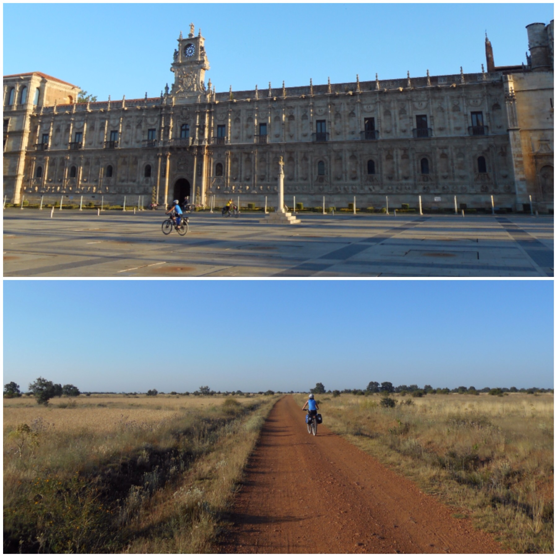Larguísima etapa a través de los páramos de Castilla. Salimos de nuevo muy temprano para intentar aprovechar las horas más frescas del día aunque al final hemos estado pedaleando las frescas y las no frescas porque hemos llegado al destino a las cinco y media de la tarde. Afortunadamente todo el día ha soplado una ligera brisa, suficiente para hacer soportable el calor pero no tan fuerte como para afectar a la marcha en bici. Por cierto, la noche anterior era la de inicio de las fiestas de Burgos y toda la noche ha habido una juerga monumental por las calles alrededor del albergue (que está en la zona histórica, a 50 m de la Catedral). Así que he dormido a ratos (Blanca casi ni se ha enterado, no hay como ser joven). Al salir a las 6.30 de la mañana del Albergue todavía continuaba la juerga.