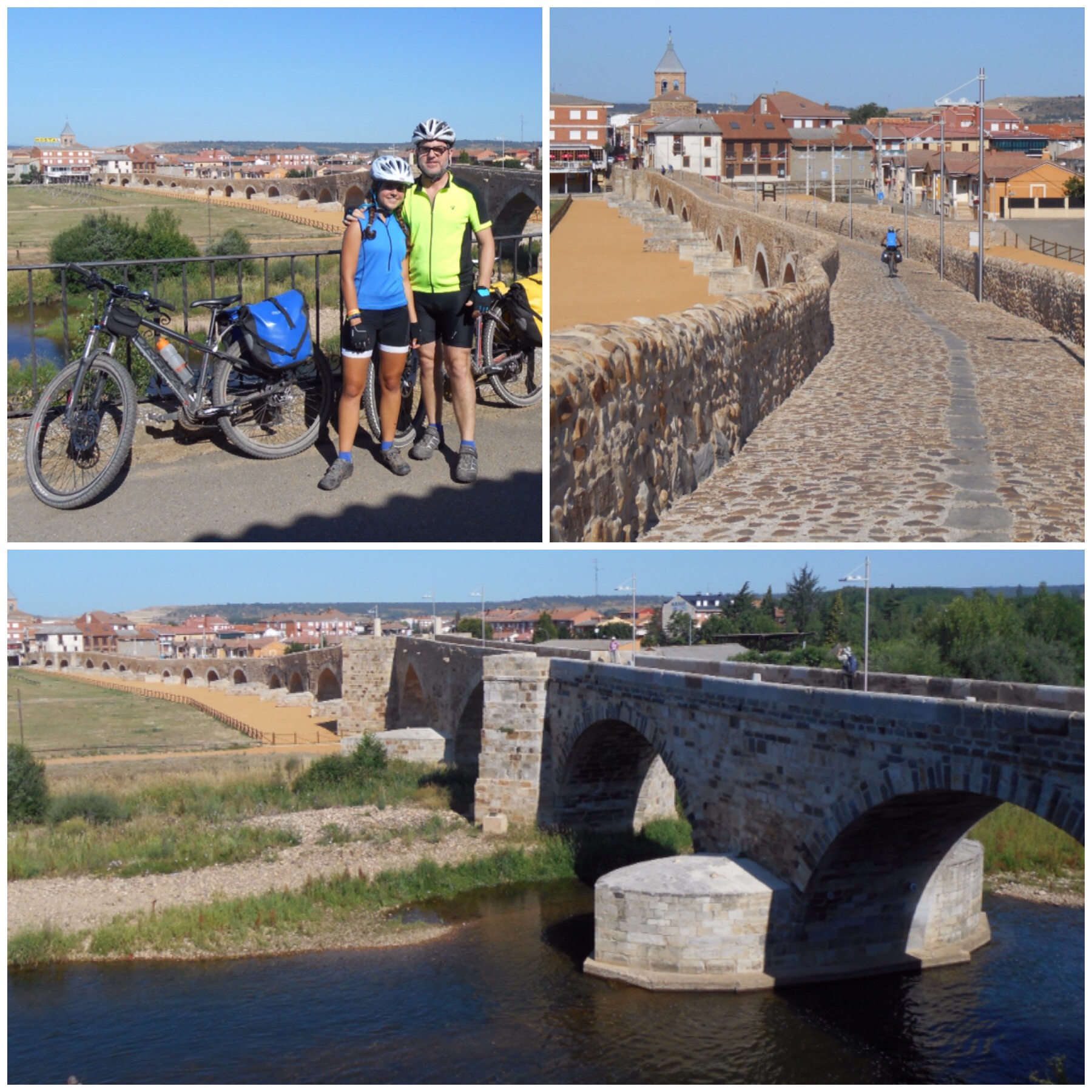 Las dos rutas vuelven a juntarse 28 km después, justo antes de entrar en Hospital de Órbigo. A este pueblo se accede cruzando un larguísimo puente medieval con 19 arcos. Parece innecesario hacer un puente tan ancho ya que por debajo pasa un río diminuto pero por lo visto el río era mucho más ancho antiguamente antes de la construcción de un embalse aguas arriba.