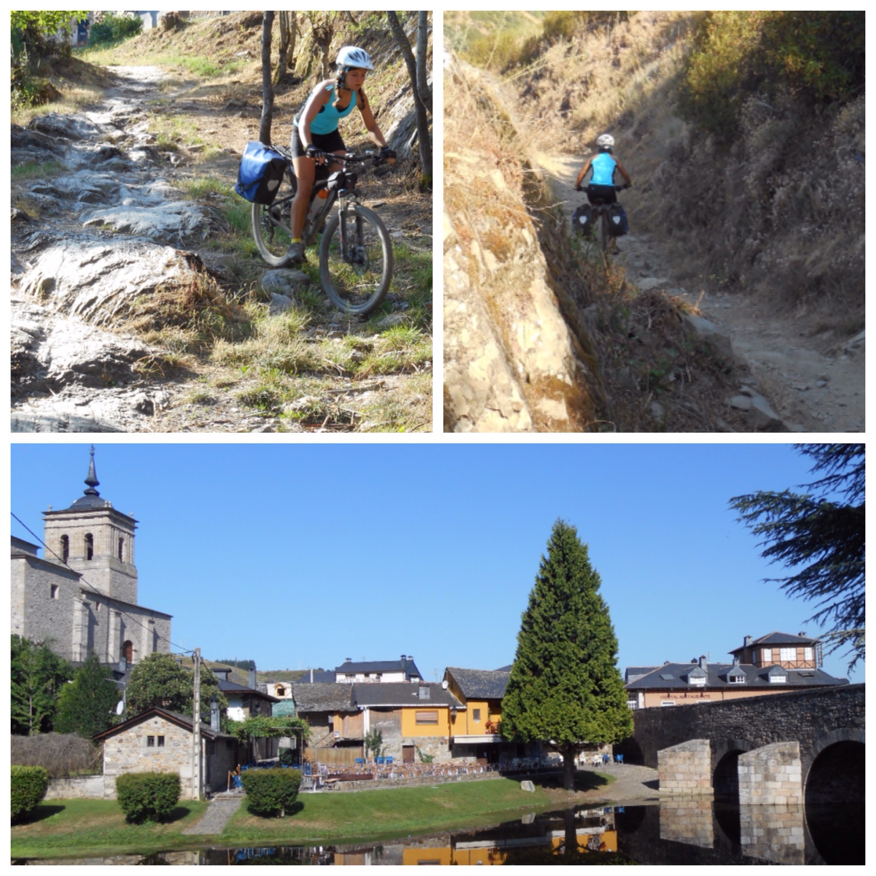 Por fin, agotados por la tensión del descenso, llegamos a Molinaseca donde nos comemos un buen bocata para reponer fuerzas mientras recordamos a un bicigrino con el que hemos coincidido en la Cruz de Ferro que nos había dicho «ya sabéis que a partir de aquí hay que ir por la carretera, ¿no? No se puede bajar de otra manera», y que se ha quedado alucinado cuando le hemos dicho que veníamos desde Saint Jean siguiendo siempre el Camino, que hoy habíamos subido a la cruz por el Camino y que también probaríamos de bajar… No es que nos parezca mal que el suba y baje como quiera pero nos hacía gracia porque ayer ya le escuchamos en el albergue hablar con otros ciclistas y decirles que la Cruz de Ferro se tenía que subir de tal manera, el Cebreiro por tal sitio, que en Castilla no valía la pena seguir el Camino y mejor por carretera porque total siempre está cerca la carretera del Camino, que para el Cebreiro mejor mandar el equipaje con uno de los servicios que los transportan de un albergue a otro y subir sin carga, y bla, bla, bla… Todo el tiempo diciendo a los demás lo que tienen que hacer sin que nadie le hubiera preguntado. Por eso nos ha hecho gracia ver la cara que ha puesto cuando ha visto que una niña lo hacía todo diferente a sus sabios consejos…