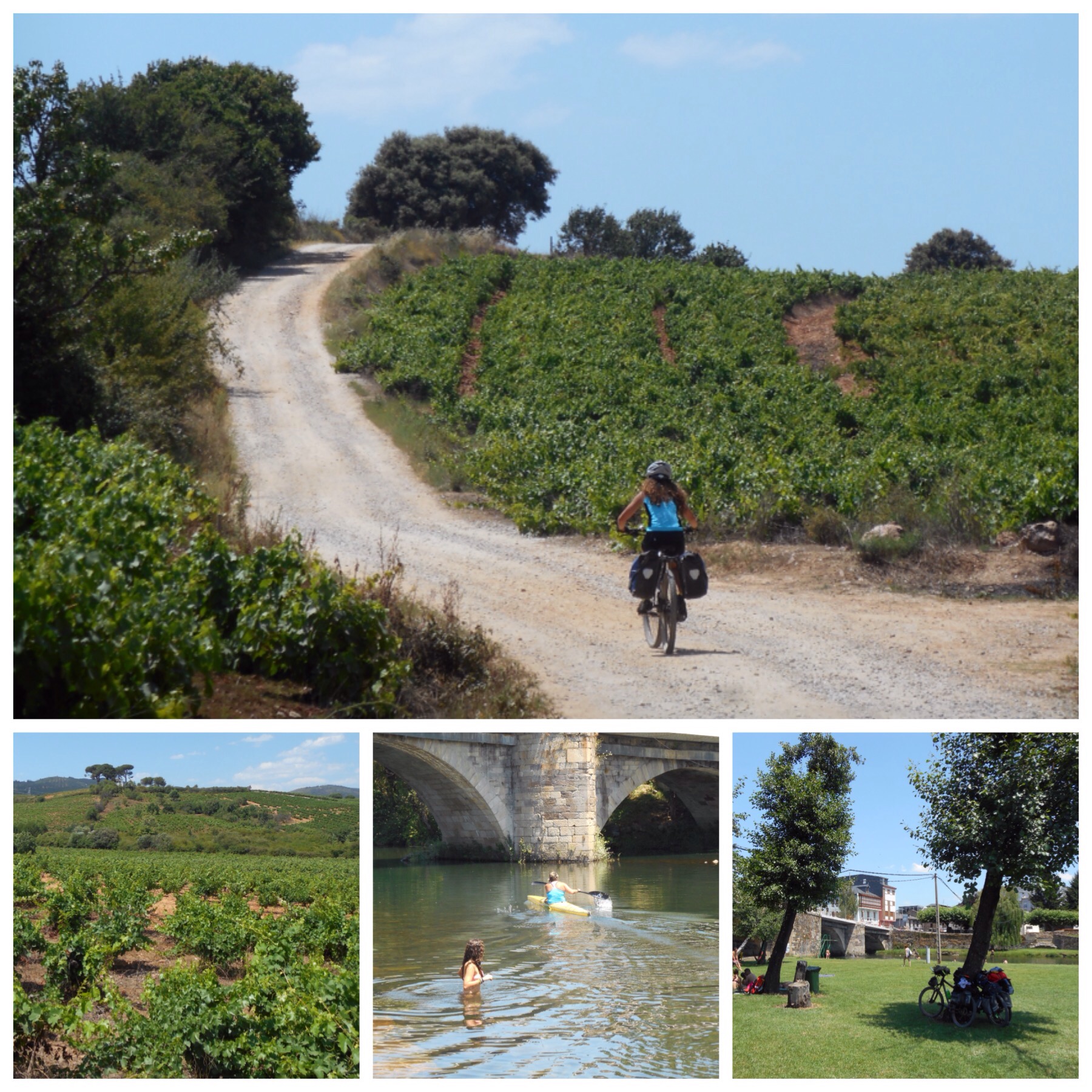 El resto del día recorremos entre viñedos parte de la comarca del Bierzo para acercarnos a Villafranca del Bierzo, final de esta etapa. A partir de mediodía el calor era insoportable y al pasar por Cacabelos no hemos podido resistir darnos un bañito en su playa fluvial. Hemos acabado dormitando un rato a la sombra de unos árboles antes de recorrer pesadamente los últimos 7 km del día hasta Villafranca.