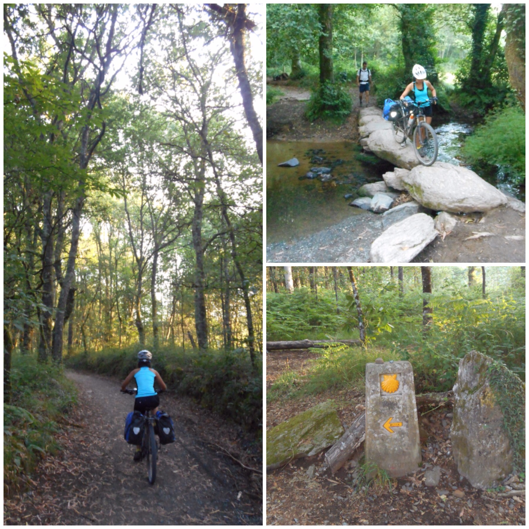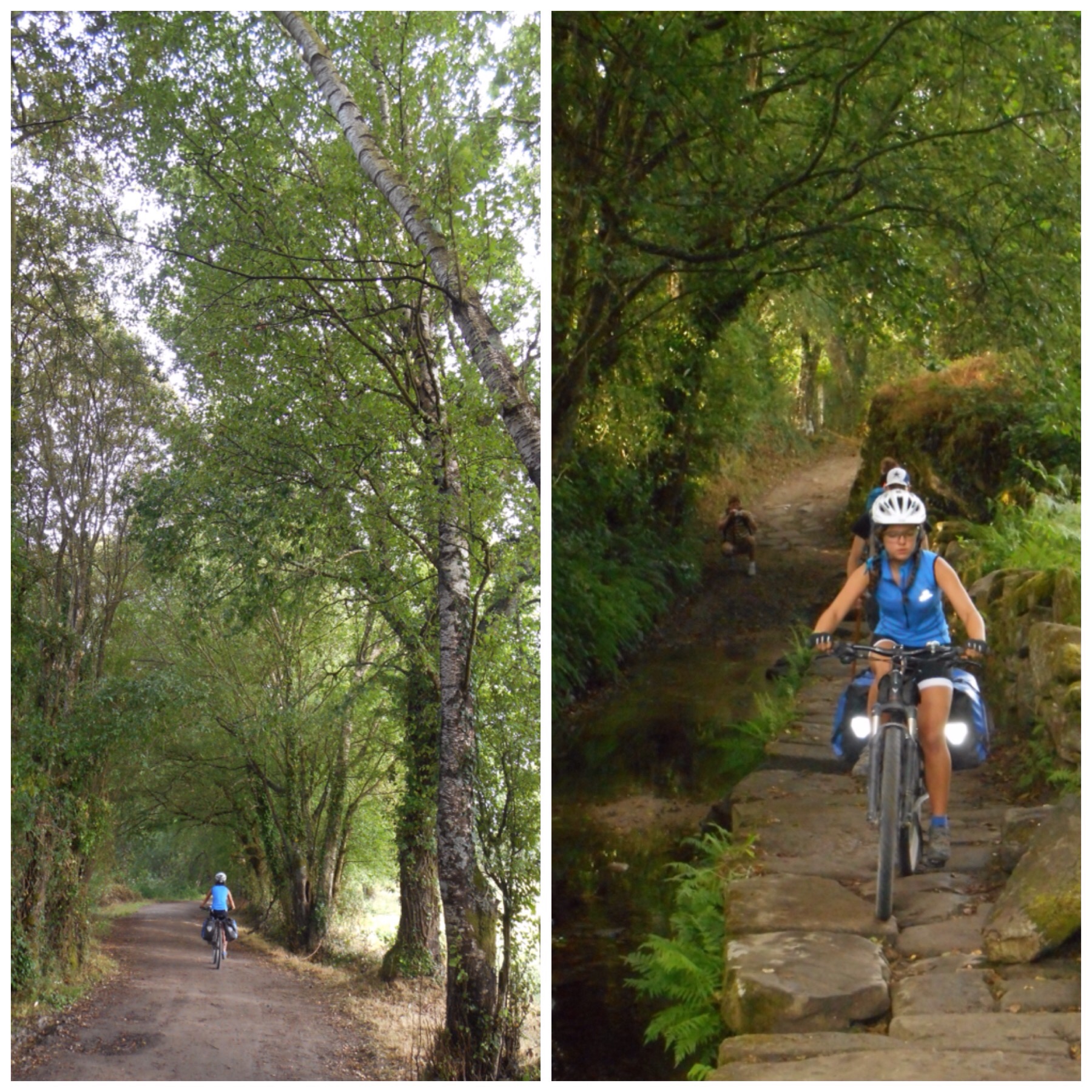 Sarria está a 113 km de Santiago y es el punto de partida elegido por los que quieren hacer el mínimo de 100 km andando que se necesitan para obtener la Compostela. Por eso es el lugar en el que más gente inicia su ruta a Santiago, entre el 20 y el 25% de todos los que acaban el Camino cada año. Y se nota, porque a partir de Sarria el Camino parece una romería. Adelantamos a cientos de peregrinos, lo que complica pasar en bici en los senderos estrechos. Curiosamente entre esos cientos nos hemos encontrado a un grupo de gente que conocíamos, ex-compañeros de Blanca en la A.E. la Soca, un grupo de scouts de Mataró, ¡el mundo es un pañuelo!