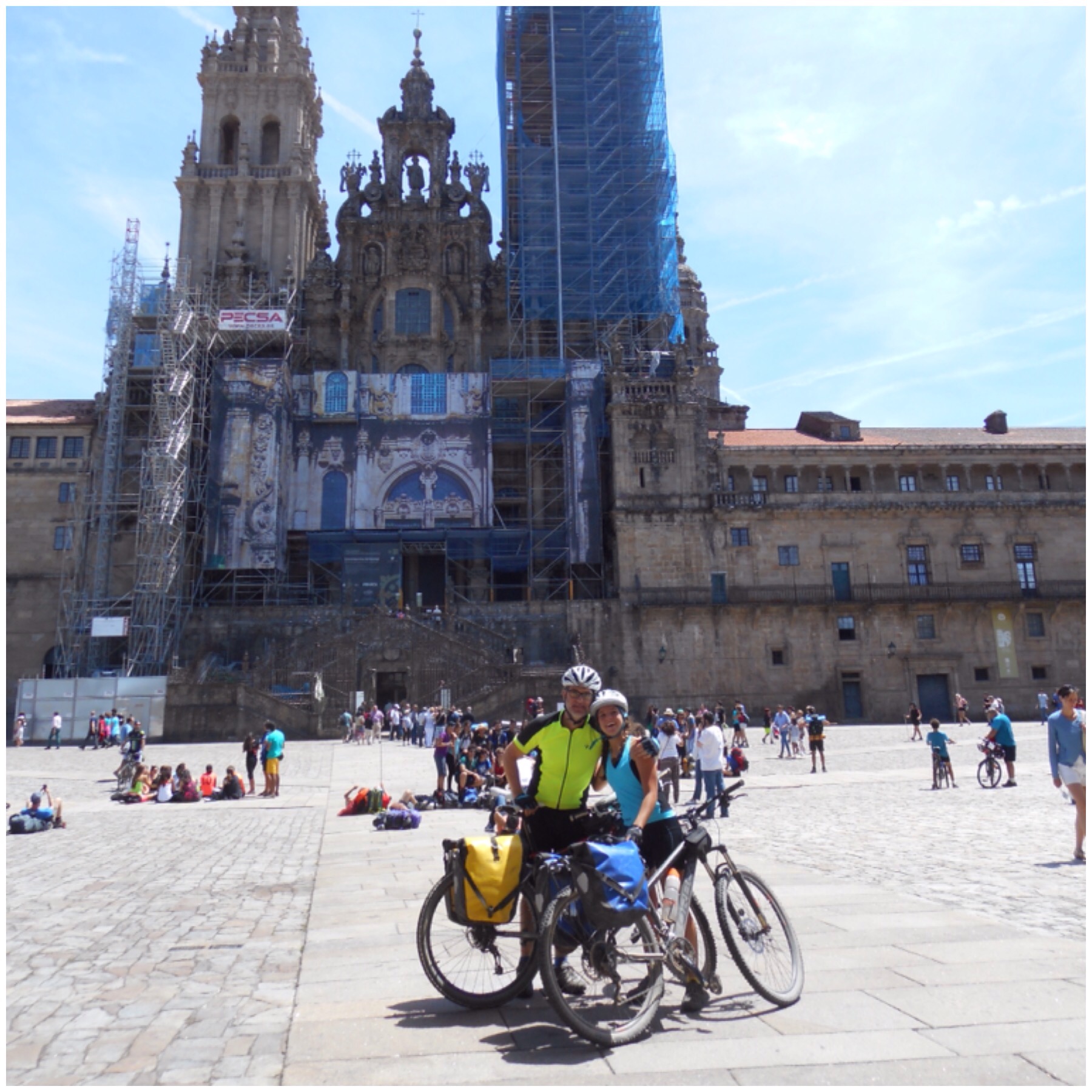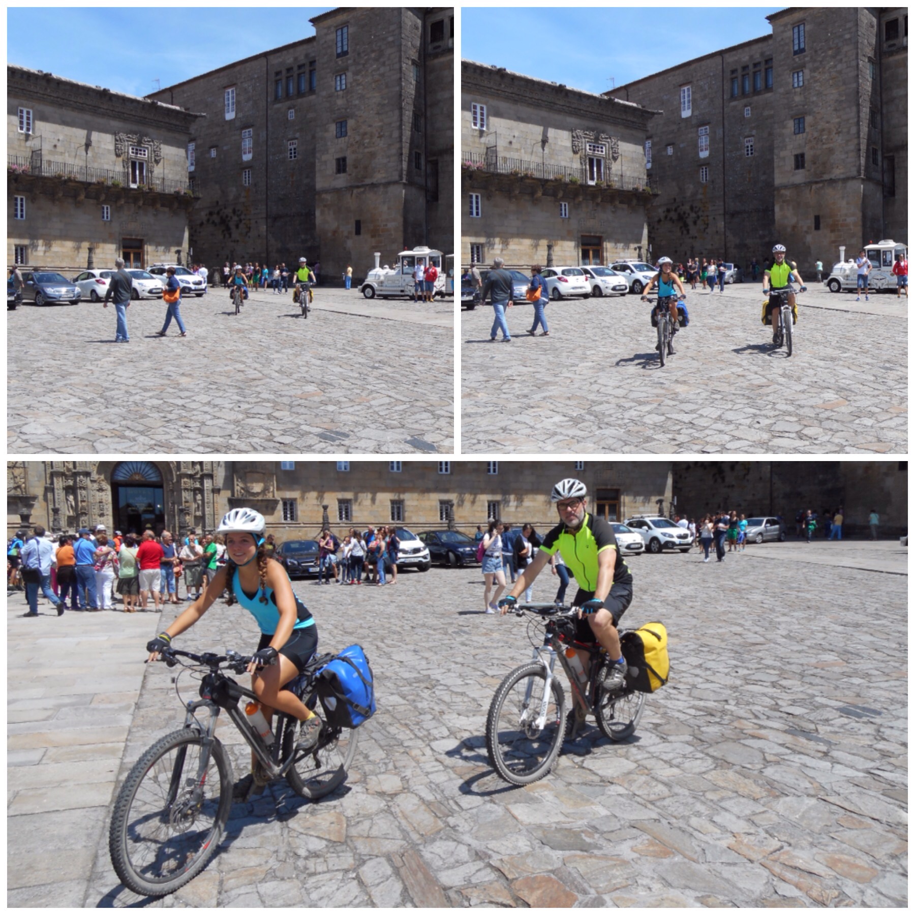 La entrada en la ciudad no es fácil y no está demasiado bien resuelta para las bicis. En la parte moderna es difícil ir por las aceras por la gente que hay y por la calzada hay muchísimo tráfico. Y cuando entramos en la parte histórica el Camino va por una calle peatonal prohibida a las bicis y, aunque hay un recorrido alternativo señalizado para nosotros, las indicaciones no están demasiado claras. En todo caso, poco a poco y con el corazón acelerado conseguimos llegar a la Plaza del Obradoiro. La entrada es caótica porque hay un millón de turistas pero por fin estamos aquí, ¡lo hemos conseguido! Es un momento intenso que solo pueden comprender los que lo han vivido. Como tantos otros de los que llegan a esta plaza, nos abrazamos, reímos, lloramos…